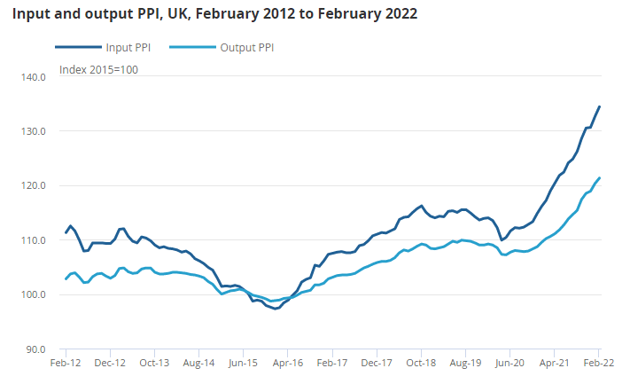 - Factory gate inflation also rose sharply, underlining just how embedded inflation is becoming in the supply chain, with the headline rate of output prices showed positive growth of 10.1% on the year to February 2022, up from 9.9% in January 2022.