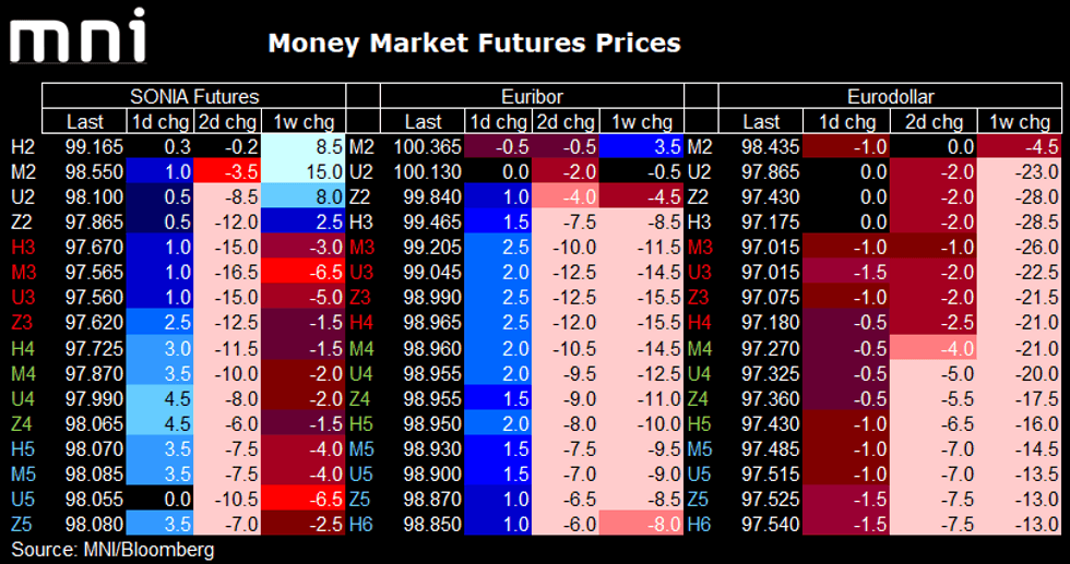 - Euribor futures are up to 2.5 ticks higher through Reds and Greens. Markets continue to fully price a 25bp ECB hike in September and there is now 44bp priced by year-end.