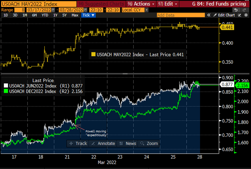 Further supply side disruption fears from a two-stage lockdown in Shanghai have helped push Fed hike expectations even higher.