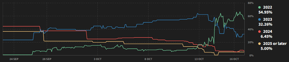 Betting markets continue to assign a greater than 50% implied probability that PM Liz Truss leaves office in 2022, with data from Smarkets showing the figure for this year currently standing at 55.0%. This number has fallen from its weekend peak of 66.7%, but it appears bettors do not believe the replacement of chancellor with new man Jeremy Hunt and the anticipated reversal of nearly all mini-budget measures will be enough to save Truss from an imminent defenestration by her party.