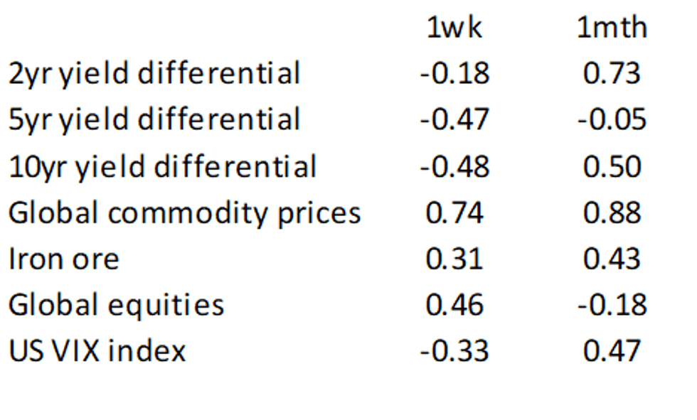 In aggregate, A$ correlations have dipped over the past week. Commodities prices have had the strongest correlation, while yield differential have moved back into negative territory from a correlation standpoint.