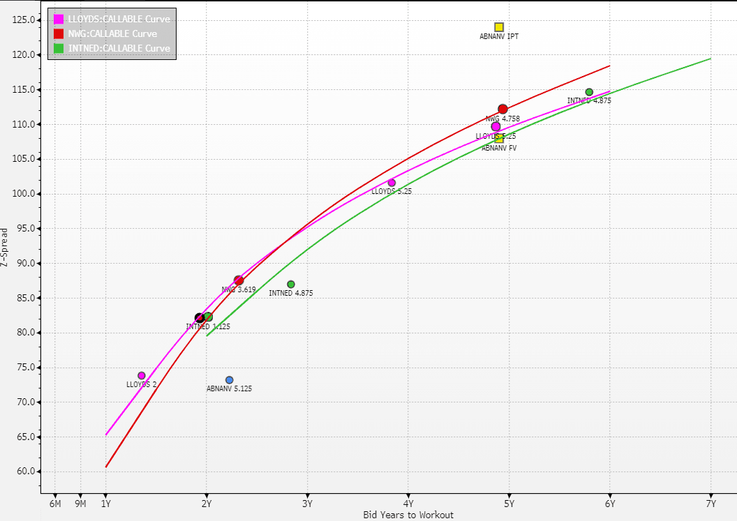 • ABNANV 4.25% 2030 trades Z+95 XCCY GBP at 4.2yrs, which is close to the INTNED Callable Sr Non Pref Curve.