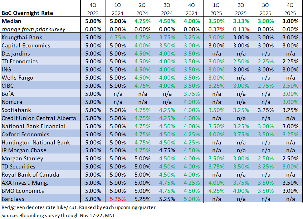 SOFR/Treasury option flow remained mixed Friday, early focus on unwinding/rolling November serial Tsy options ahead today's expiration (Nov SOFR options expire in 2 weeks). Underlying futures off lows, trading mildly higher in the short end to intermediates. As such, projected rate hikes into early 2024 inch lower: November at 0% to 5.325%, December cumulative of 4.3bp at 5.372%, January 2024 cumulative 6.9bp at 5.398%, March 2024 at 2.8bp at 5.356%. Fed terminal at 5.40% in Feb'24.