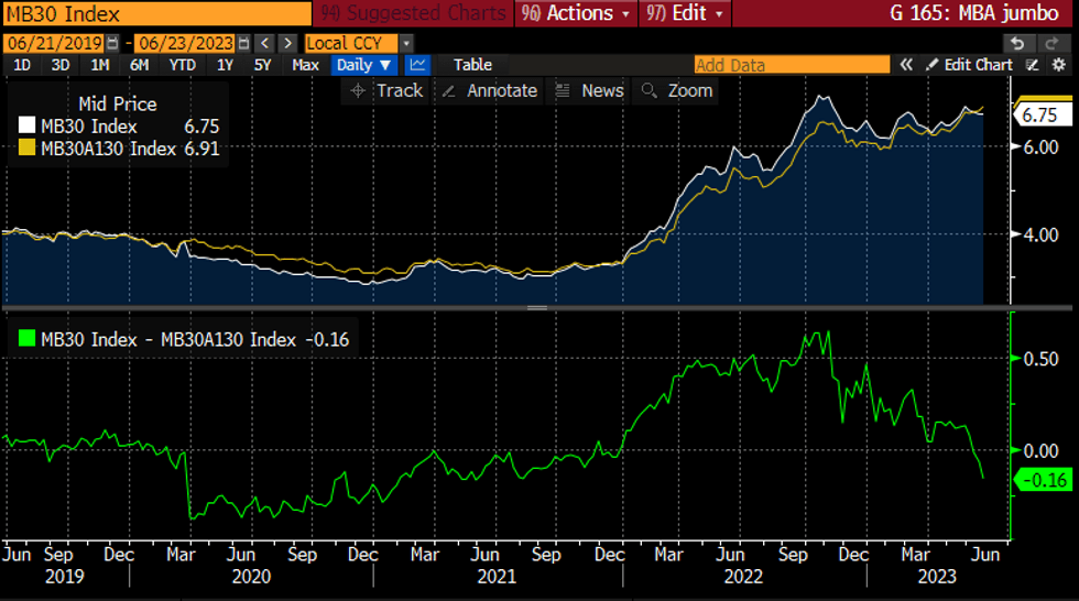 MBA 30Y conforming mortgage rates for regular (white) and jumbo (yellow) loansSource: Bloomberg