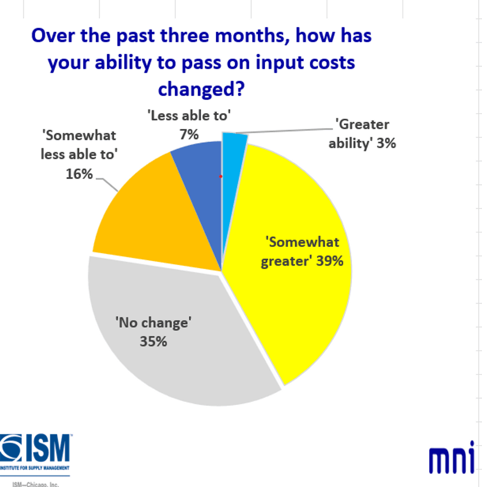 In April, the Chicago SurveyTM asked firms “Over the past three months, how has your ability to pass on input costs changed?[1]”
