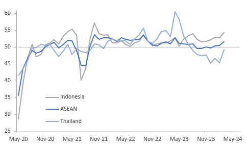 The S&P Global ASEAN manufacturing PMI rose further into expansion territory in March at 51.5 from 50.4. The improvement was driven by positive domestic new orders growth which resulted in a pickup in production and employment, but foreign orders contracted. Only the Philippines and Indonesia are in expansionary territory above 50. Most of ASEAN is optimistic looking forward.