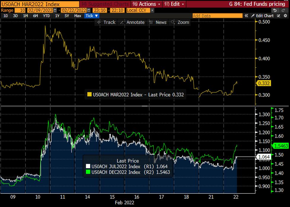 Fed Funds futures cumulative pricing for March, July and December meetings. Source: Bloomberg
