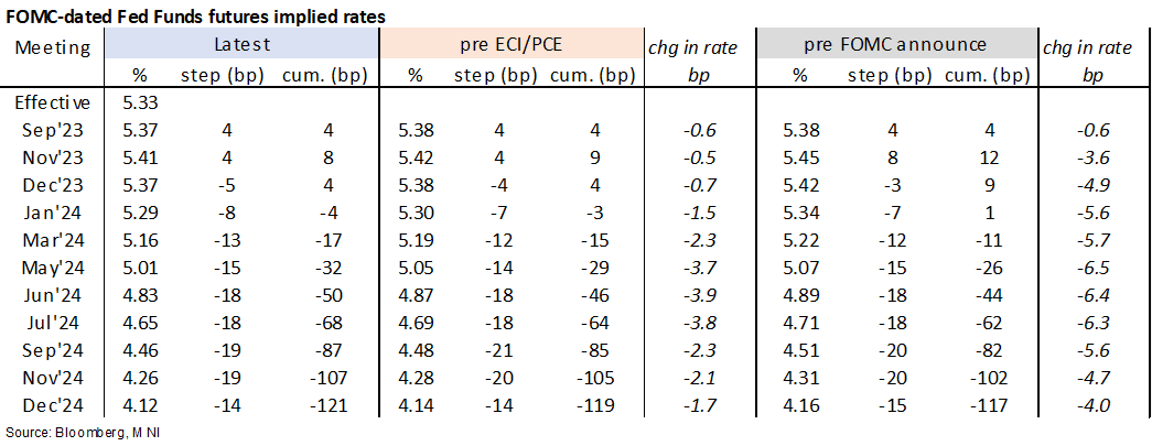 - Fed Funds implied rates have pushed lower today, not so much for near-term meetings which continue to expect a modest amount of additional tightening, but more so with a build in cut expectations into 2H24 especially.