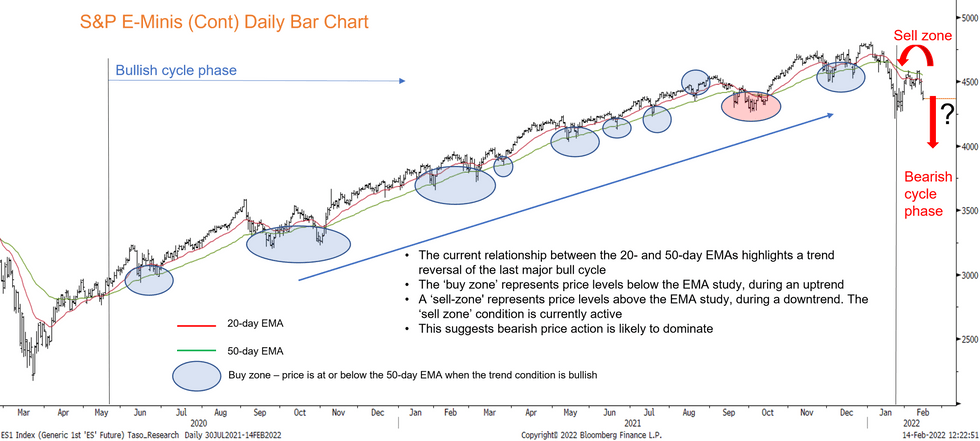 The E-Mini S&P 500 has been in an uptrend since Mar 23 2020. Since early January, however, a shift in the trend condition appears to have occurred that suggests the uptrend has reversed. The sharp sell-off in January has resulted in a key trend indicator reversing from a bull mode condition to a bearish one and price activity in February has reinforced this trend warning.