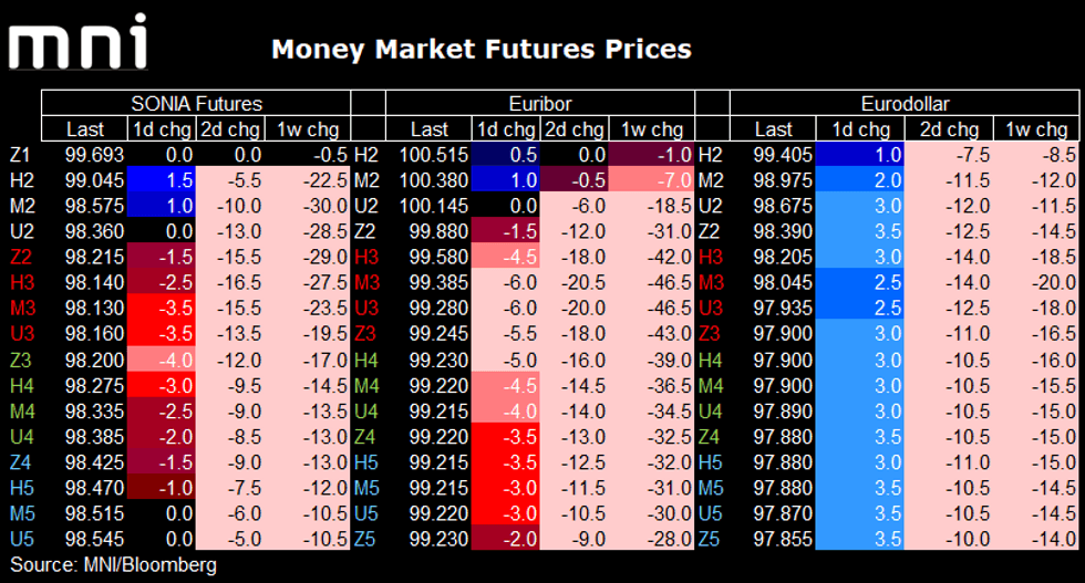 SONIA and Euribor futures are both seeing little movement in Whites (if anything less priced in at the very front-end) but downward pressure focused around the Reds. The biggest mover is the Mar-23 Euribor future, following comments from Knot over the weekend that we could see a first 25bp rate rise in Q4-22 and a second in Q1-23. Indeed, markets are now pricing an even faster pace than this with 50bp of rate hikes fully priced by end-2022. This would bring the deposit rate to 0%. SONIA futures pricing has consolidated the five further 25bp hikes fully priced in for 2022 (Bank Rate to 1.75%) with 4 hikes fully priced by August.