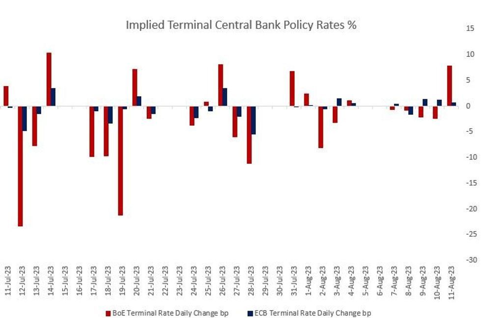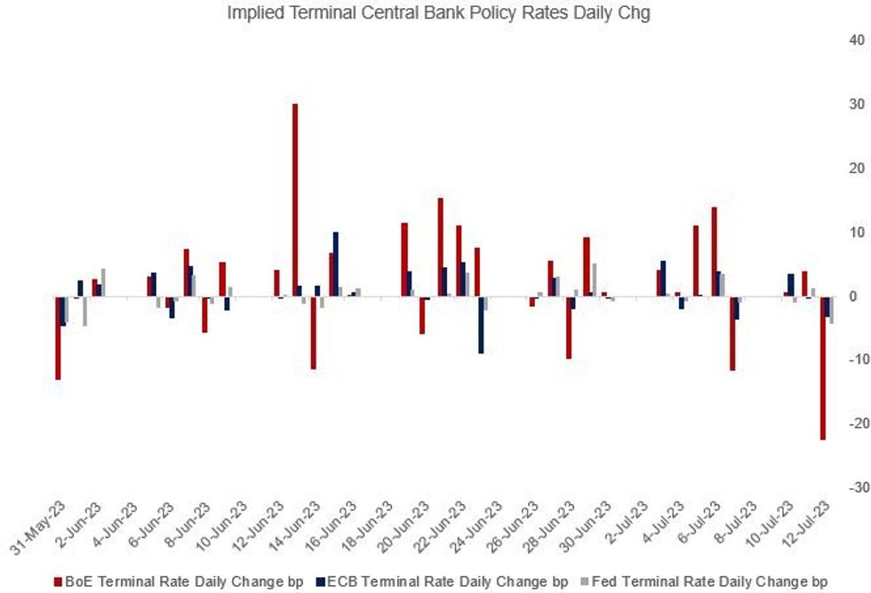 BoE terminal rate pricing continues to fall following the softer-than-expected US inflation report, with OIS implying Mar 2024 Bank Rate at 6.26% (126bp of further hikes left in the cycle, -22.6bp on the day).