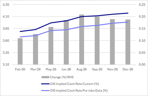 RBA-dated OIS pricing has firmed by around 11–21bps across meetings since the release of December’s stronger-than-expected labour market data on 22 January.