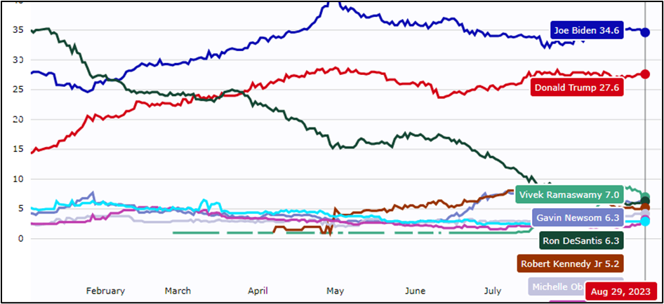 Betting markets see President Biden as slight favourite to win the 2024 presidential election with an aggregated implied probability of 34.6% to win, ahead of second favourite, former President Donald Trump with 27.6%.