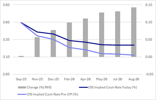 Ahead of today’s RBA policy decision, RBA-dated OIS pricing is sharply firmer across 2026 meetings versus last Wednesday’s CPI levels.