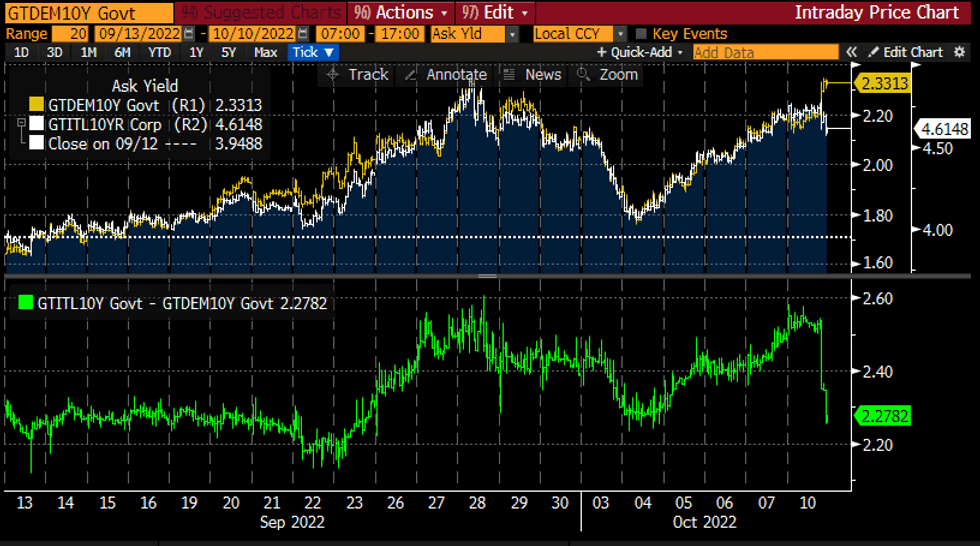 10Y BTP (white), Bund (yellow) and spread (green)Source: Bloomberg