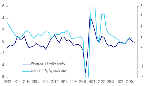 The Westpac lead index fell 0.03% m/m in September bringing the 6-month annualised rate to +0.04% from -0.16%. It has oscillated around zero over the last 5 months. This measure leads detrended growth by 3 to 9 months and signals that growth may slow in H2 but be around trend early in 2026. Westpac is forecasting 2% growth in 2025 with it improving in 2026.