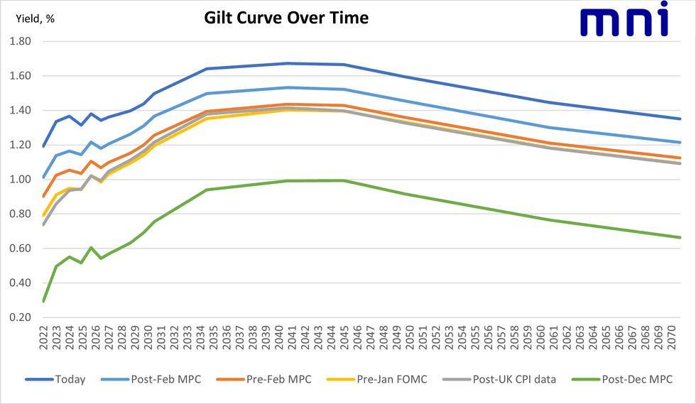 Some huge moves in gilts today with a decent steepening of the curve with 10-year gilt yields up 9.2bp at the time of writing on the day. This puts them above 1.50% for the first time since 2018. This has happened against the backdrop of the syndicated launch of a new 50-year gilt and a political cabinet reshuffle. The chart below shows the entire curve has shifted substantially higher since before the February MPC meeting. Indeed, the magnitude of the move since the December MPC meeting (most of the curve seeing yields 50-60bp higher) is stark.