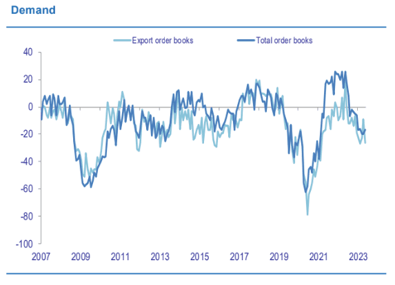 - Export order books declined markedly, whilst business sentiment deteriorated further implying pessimistic outlooks for the industry for a fifth consecutive month.