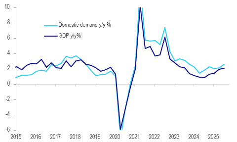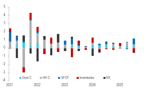 Q3 GDP was lower than expected at 0.4% q/q & 2.1% y/y after an upwardly revised 0.7% q/q & 2.0% y/y. However, the details are a lot stronger than the headline with domestic demand rising 1.2% q/q to be up 2.6% y/y, the strongest since Covid-impacted Q1 2022. The softer GDP print was due to a 0.5pp inventory detraction, largest since Q2 2023, which may reflect stronger demand driving a drawdown and which may be followed by a rebuild.