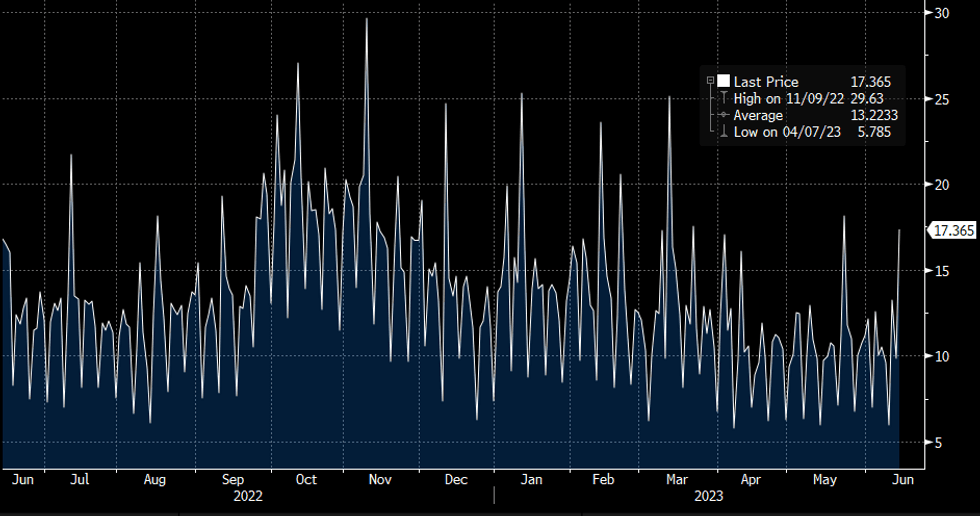 Cash tsys have opened dealing 0.5-2 bps cheaper across the major benchmarks, the curve has bear flattened. Fedspeak from Gov Waller this morning noted that he sees two more 25bp increases this year and that policy will need to remain restrictive for some time. Waller also said that September is a live meeting for rate policy.