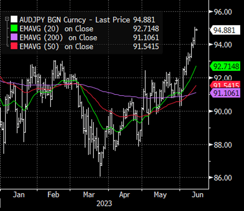 AUD/JPY printed its highest level since early November yesterday, and a fresh year to date high. The pair rose ~0.7%, and last prints at ¥94.85/95.