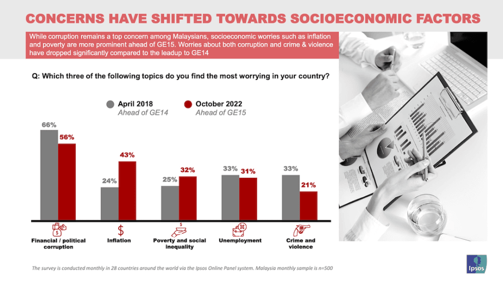- "While corruption remains a top concern among Malaysians, socioeconomic worries such as inflation and poverty are more prominent ahead of GE15. Worries about both corruption and crime & violence have dropped significantly compared to the leadup to GE14," Ipsos said in a statement.