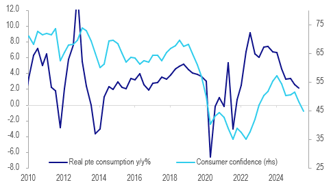 Thailand’s University of the Thai Chamber of Commerce consumer confidence index fell to 50.1 in August from 51.7, around neutral. Economic conditions declined 1.5 points to 44.1, signalling that private consumption growth slowed further in the quarter. Political uncertainty likely added to pessimism regarding the economy, as former PM Paetongtarn was suspended on July 1 but wasn’t officially removed until August 29. The new PM has promised elections within four months and so political instability looks likely to continue for now.