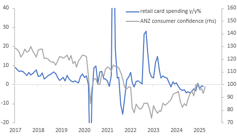 There was a broad-based pick up in ANZ consumer confidence with it rising 5.5% to 98.3 in April boosted by another 25bp of monetary easing during the month and despite heightened global uncertainty around US trade policy. It has resumed its uptrend and printed at its highest since December. Both current and future conditions improved.