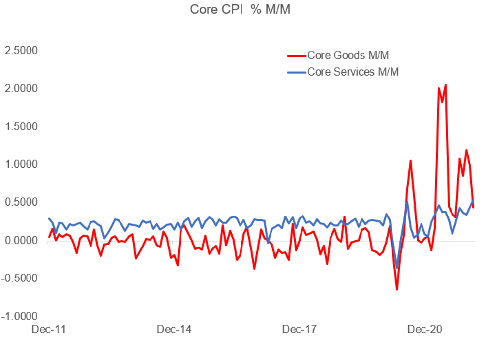 Within the core CPI data, a huge sequential slowdown in core goods prices: +0.44% M/M, less than half the pace of the previous 4-months' average (+1.03%). BUT core services accelerated to the fastest (+0.53% M/M) since 1992.