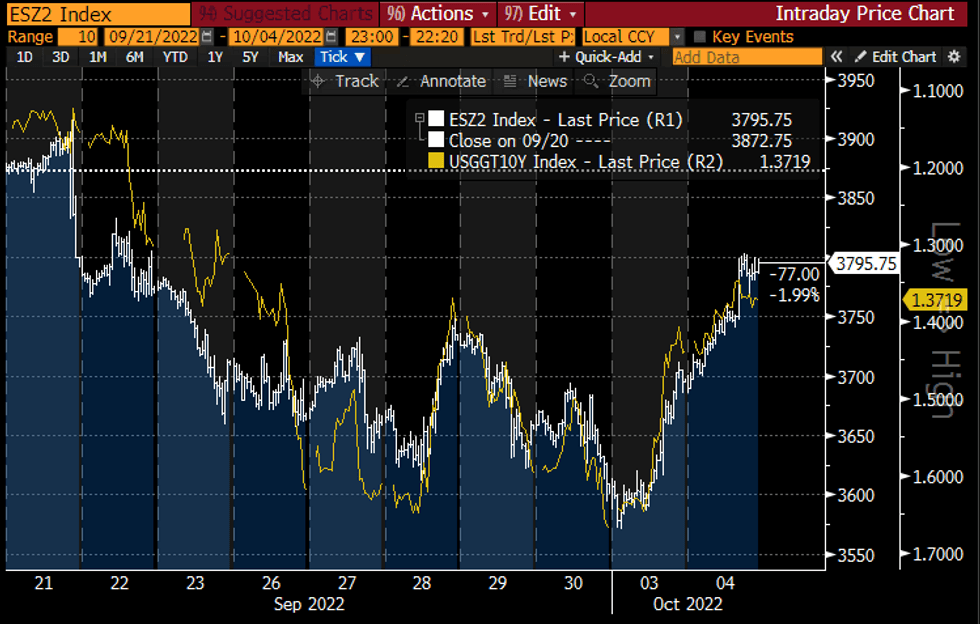 ESZ2 (white) and inverted US 10Y real yield (yellow)Source: Bloomberg