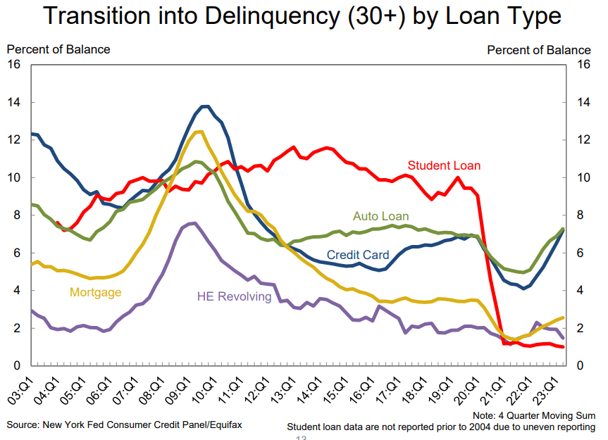 - The chart below shows this clearly, and see the following link for more information including the continued sizeable increase for those transitioning into serious delinquency (90+ days) for credit cards: https://www.newyorkfed.org/medialibrary/interactives/householdcredit/data/pdf/HHDC_2023Q2