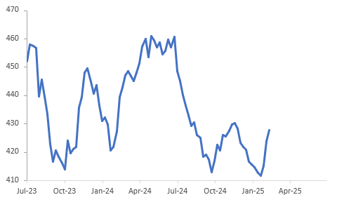 - The EIA reported a 4.07mn US crude inventory build last week driven by a sharp increase in Canadian flows to beat possible tariffs. US stocks are now 16.2mn barrels higher since Trump’s inauguration. Gasoline fell 3.04mn, its first decline since November, while distillate rose 0.1mn. Refining utilisation is up 0.5pp to 85% to be 4.4pp higher than the same time last year.