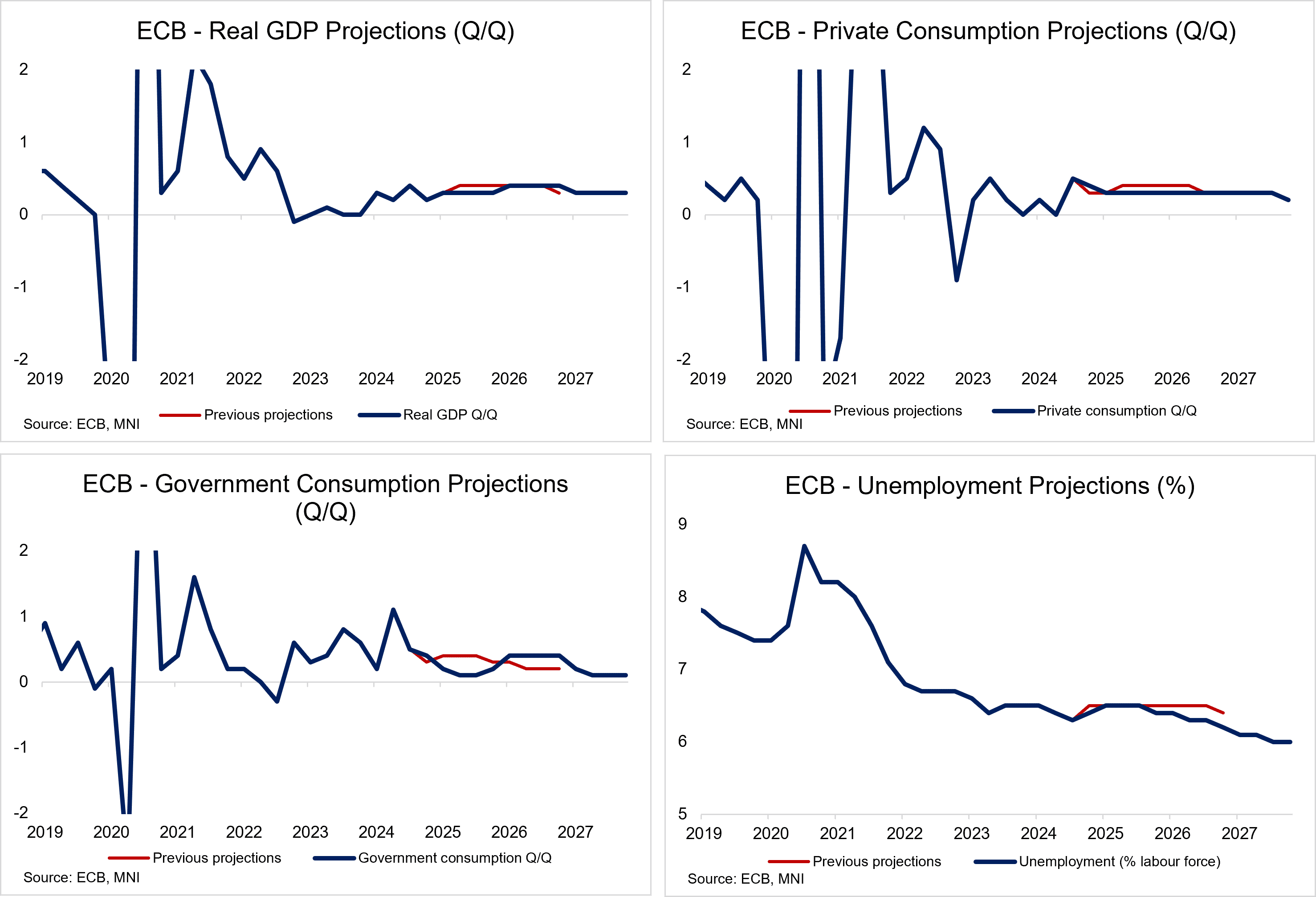 The ECB made small downward revisions to its Q/Q real GDP growth projections in December, with President Lagarde noting in the press conference that risks remain tilted to the downside. Eurosystem staff write that “the outlook for GDP growth has been revised down mainly owing to revisions to data on investment in the first half of 2024, expectations of weaker export growth in 2025, and a small downward revision to the projected expansion of domestic demand in 2026”