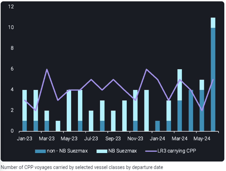 Dirty-to-clean switches have entered a new dimension, occurring on bigger tankers, Vortexa said.
