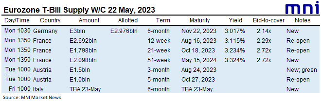 Austria and Italy both still look to sell bills this week while Germany and France came to the market yesterday. We look for issuance at first round operations of E16.6bln, down from last week's E18.7bln.