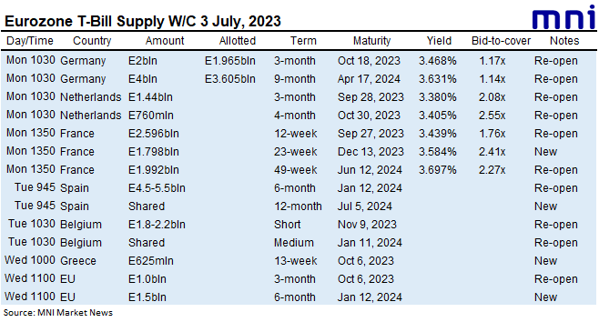 Spain, Belgium, Greece and the EU still look to sell bills this week while Germany, the Netherlands and France, came to the market yesterday. We look for issuance at first round operations of E24.4bln, up from last week's E18.8bln.