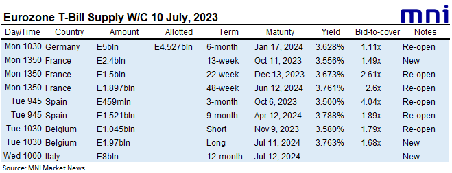 Italy all due still sell today while Germany, France, Spain and Belgium have already come to the market this week. We look for E23.8bln of issuance in first round operations, broadly in line with the E23.5bln last week.