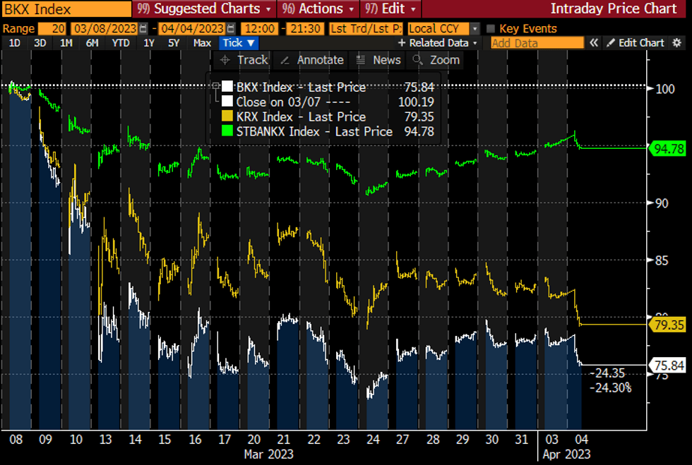 - Ultimately though US banking concerns and related equity volatility had a much bigger impact, with Treasuries pulling Bunds and Gilts to session highs in a strong risk-off move.