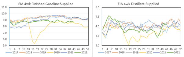 EIA data shows the four week average gasoline product supplied falling again bringing it back down to 2020 levels. The fall in implied demand has not eased the tight supplies significantly with stocks still below normal. Distillate product supplied is still near the seasonal highs after recovering from below 2020 levels just 6 weeks ago.