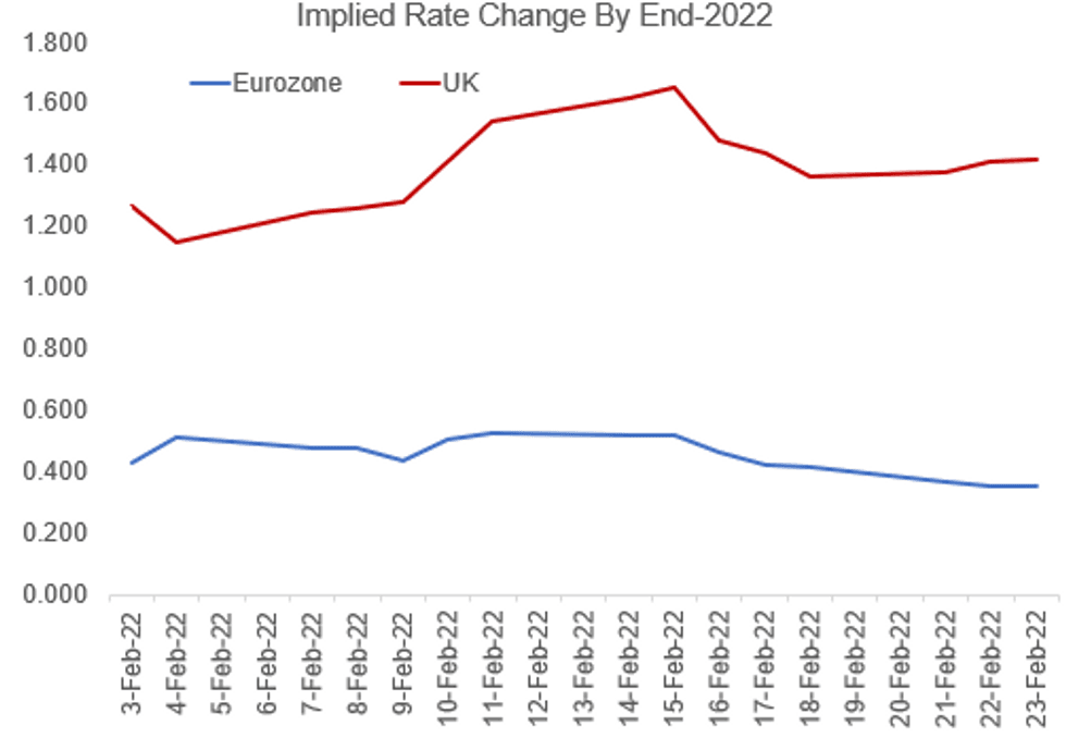 Europe short-term rate futures are weaker as perceived Russia-Ukraine risks are faded and central bank tightening prospects come back into focus.