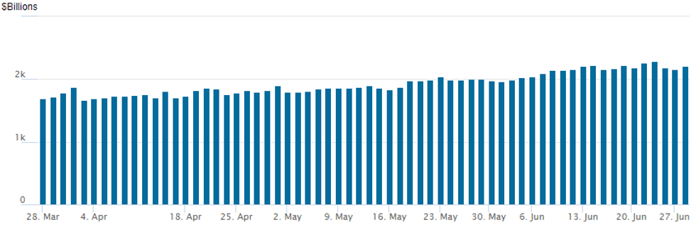 NY Fed reverse repo usage climbs to $2,213.784B w/ 97 counterparties vs. $2,155.942B prior session. Compares to record high of $2,285.428B from Thursday June 23.