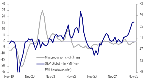 November manufacturing production was weaker than expected falling 4.2% y/y, the sharpest contraction since August, likely impacted by recent severe weather events. The series can be volatile but the 3-month average is also negative holding at around -1% y/y. The S&P Global manufacturing PMI has signaled positive activity since May and a pickup in growth since August, which hasn’t materialized. The November PMI at 56.8 and the pickup in November business confidence signal that growth in the sector should improve.