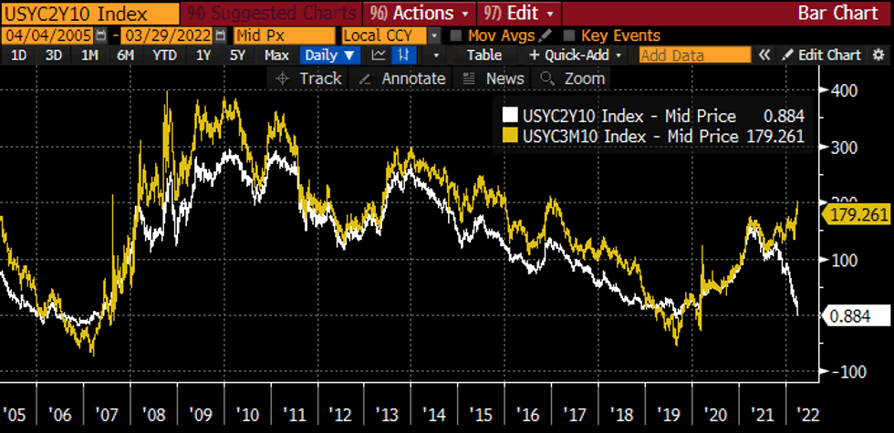 US 2s10s and 3M-10Y spreads.Source: Bloomberg