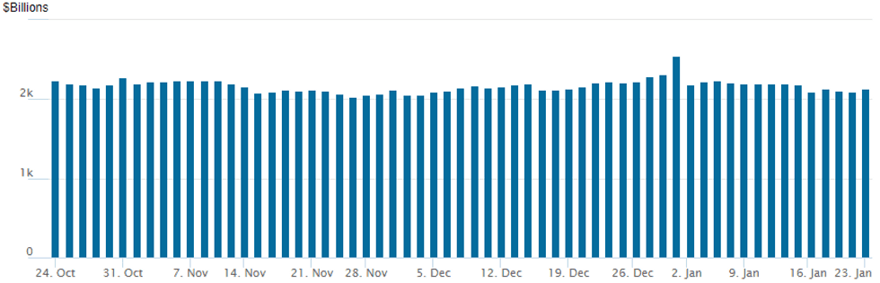 NY Fed reverse repo usage climbs to $2,135.499B w/ 105 counterparties vs. prior session's $2.090.523B. Compares to Friday, Dec 30 record/year-end high of $2,553.716B (prior record high was $2,425.910B on Friday, September 30.