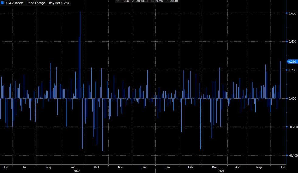 UK 2 Year yields hitting fresh session highs with under 10 minutes to go to the cash close: with its rise of over 26bp on the day (last 4.898%) this is set to be the biggest 1-day increase since September 26th 2022's 61bp rise. See chart