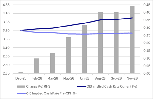 RBA-dated OIS pricing is modestly firmer today for meetings beyond May 2026, ahead of the RBA’s policy decision.