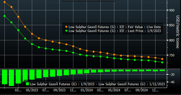 Gasoil curve backwardation is strengthening beyond Feb23 with risks to global supplies following the start of the EU ban on Russian products from 5 Feb. Europe are expected to import 2.68m tons of diesel from Russian Baltic and Black Seas ports in January according to Bloomberg at the end of December. Refiners are boosting supplies in an attempt to build stocks ahead of the ban.