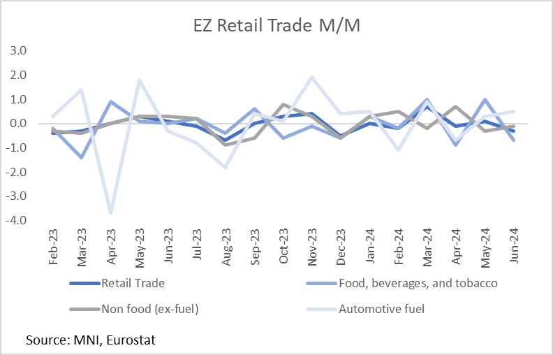 Eurozone volume of retail trade growth came below expectations at -0.3% M/M in June (vs -0.1% consensus, 0.1% prior) - the weakest since December 2023. On an annual basis, volumes of retail trade also disappointed at -0.3% Y/Y (vs 0.1% consensus, +0.5% prior revised from 0.3%) - returning the annual print to a negative reading for the first time since February 2024.