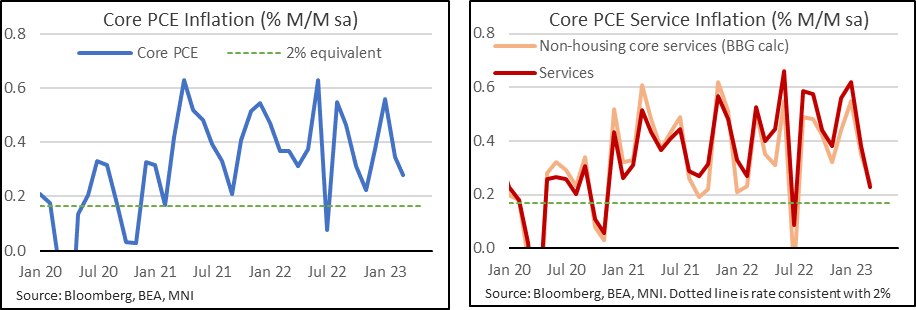 - The Fed can however take some consolation that the relative upward surprise was focused early in the quarter, which instead has seen the latest monthly rates slow from 0.56% M/M in Jan, to 0.35% in Feb and 0.28% in March data released Apr 28.