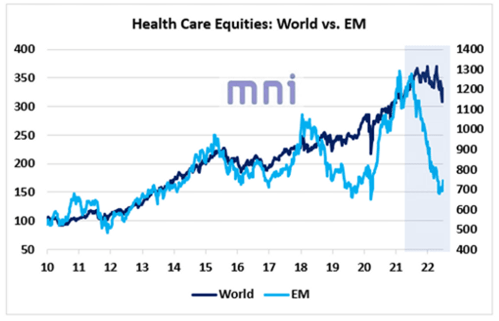 We previously saw that the past year was marked by a significant divergence between EM and World health care equities. While world health care equities are down 12% since their January highs, EM health care stocks are down nearly 45% since in the past year, erasing 80% of their post-Covid gains.